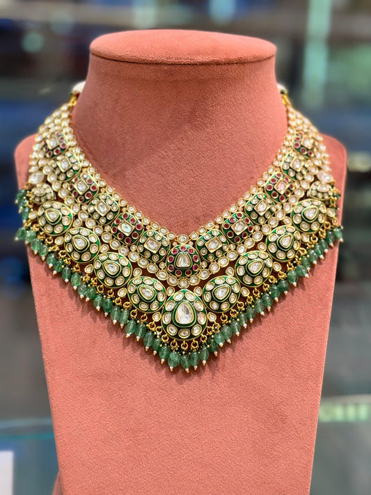 Polki jewelry, rooted in the Mughal era, features uncut diamonds for a raw, regal charm. Our imitation Polki collection captures this elegance with high-quality materials like glass stones, alloy metals, and gold/silver plating. Perfect for weddings, festivities, and everyday glam, these lightweight, intricately crafted pieces offer timeless luxury.